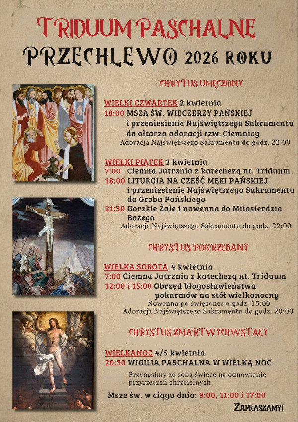 - Jeżeli ktoś chciałby włączyć się w liturgię Triduum Paschalnego prosimy, aby zgłosił taką chęć w zakrystii. Zapraszamy chętnych do czytań i śpiewu.